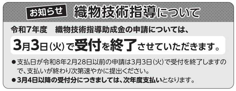 【助成金】令和7年度 織物技術指導助成金の受付終了について 2026年2月20日 助成金 お知らせ 重要なお知らせ2025年度京丹後市商工会令和7年度織物技術指導助成金 by admin_s. 【助成金】令和7年度 織物技術指導助成金の受付終了について 令和7年度の「織物技術指導助成金」の申請について、以下の通りご案内いたします。 申請期限を過ぎますと受け付けができませんので、お間違いのないようお手続きをお願い申し上げます。 お問合せ 京丹後市商工会 TEL 62-0342 この記事をSNSでシェア! 関連記事 【助成金】令和7年度 織物技術指導費補助金について 【助成金】(6/30迄) 令和7年度意欲ある部会事業推進助成金の募集について 【補助金】(6/18迄) 令和7年度 中小企業持続経営支援補助金(ステップアップ枠)のご案内 【セミナー】事業計画書作成セミナーの開催について 前の記事